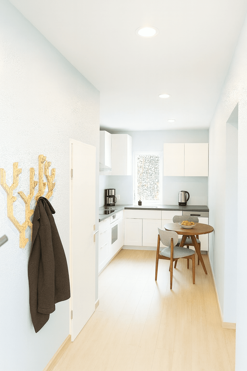 Sintered stone countertop throughout and melamine cabinets in kitchen