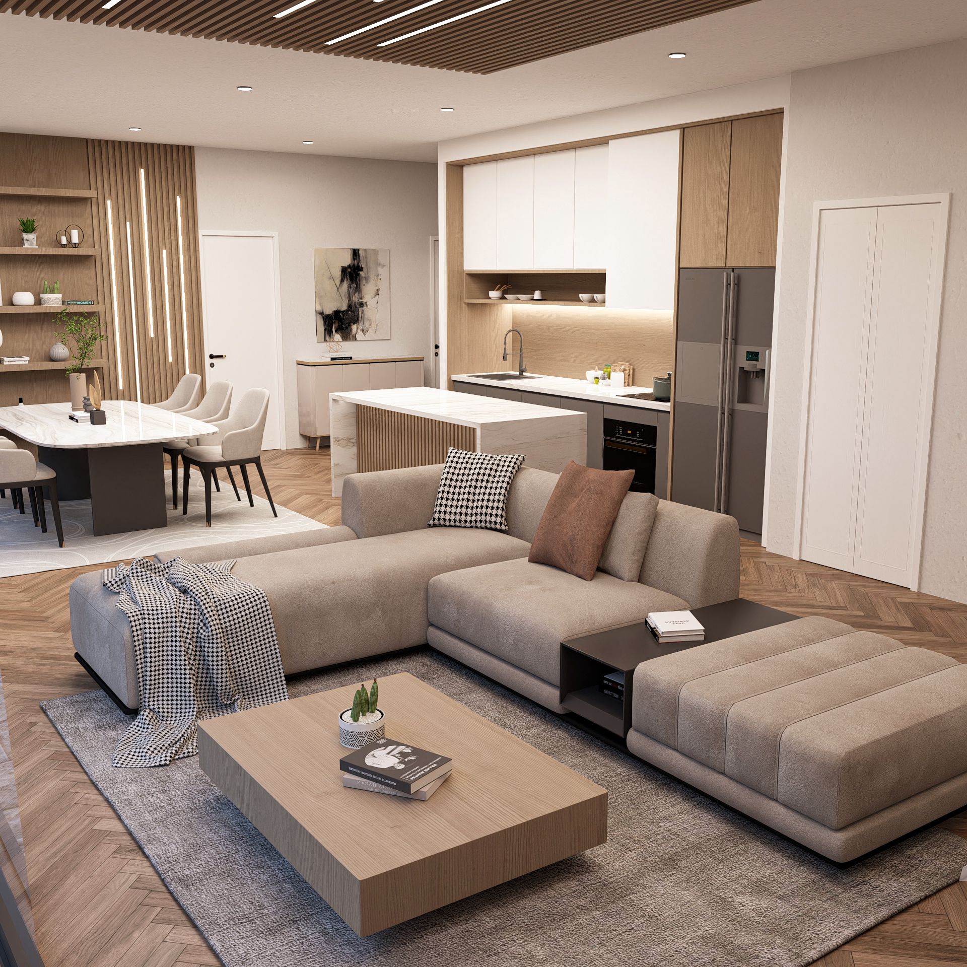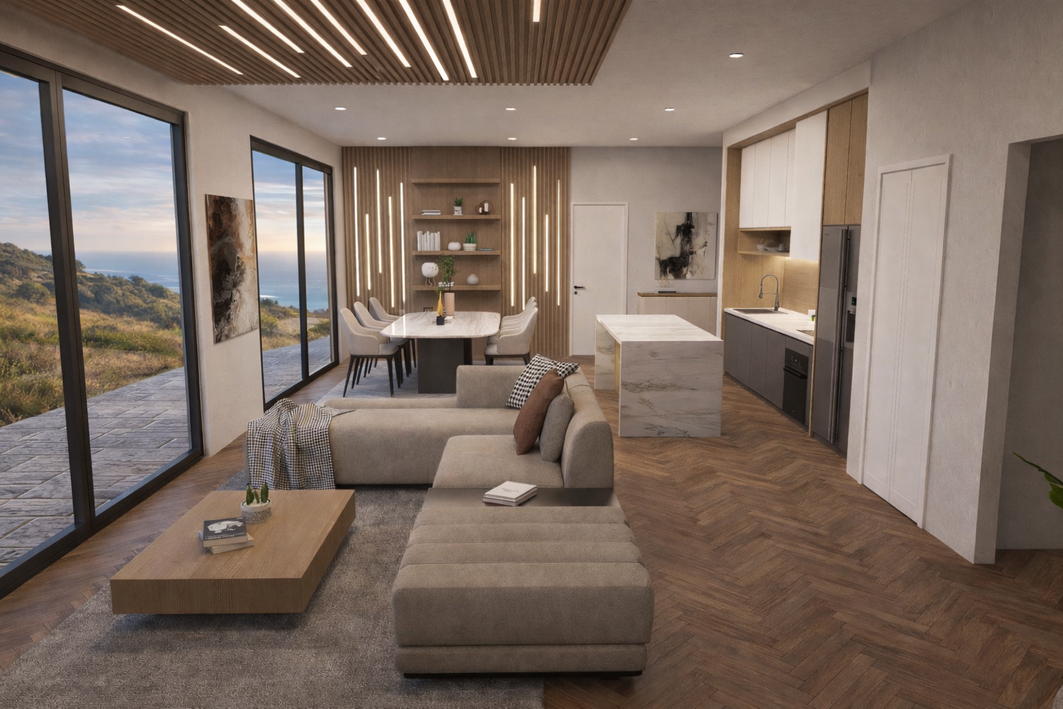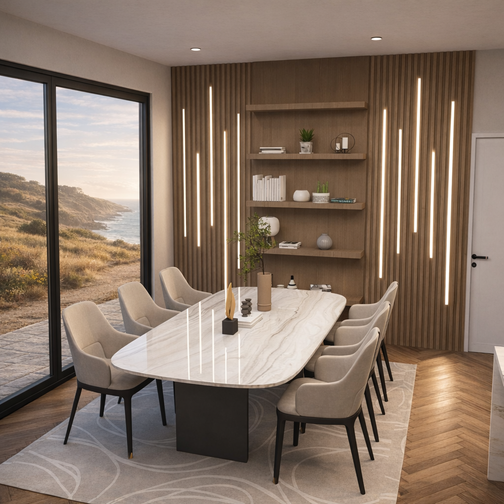 Sintered stone countertop throughout and melamine cabinets in kitchen